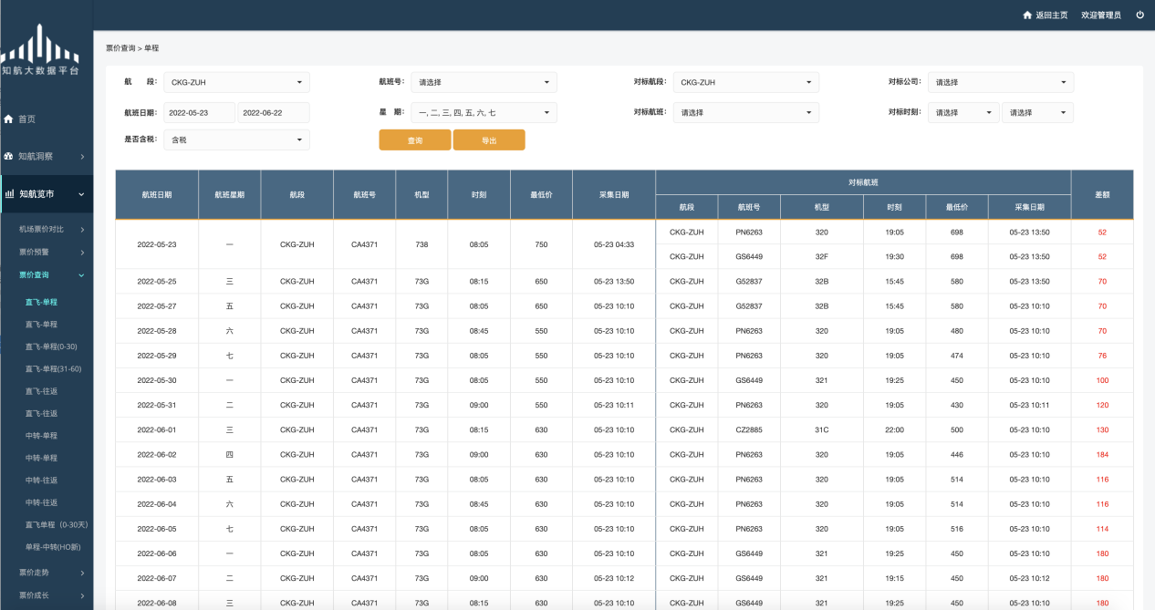 航线未来票价走势数据,监控票价走势,及时响应预售票价变化;订制航线票价、区域票价、 机场整体票价数据实时查询。
